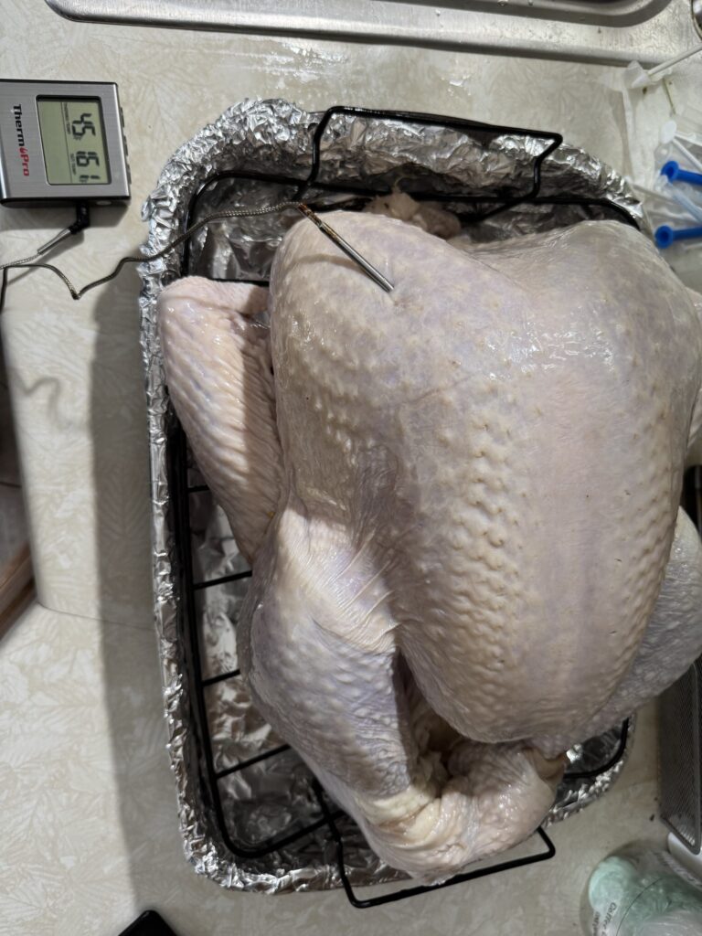 プローブは、先端がちょうど胸肉の一番分厚いところの真ん中にくるようにブッ刺す必要がある。外の皮に近すぎても、腹の空洞に近すぎてもダメ。