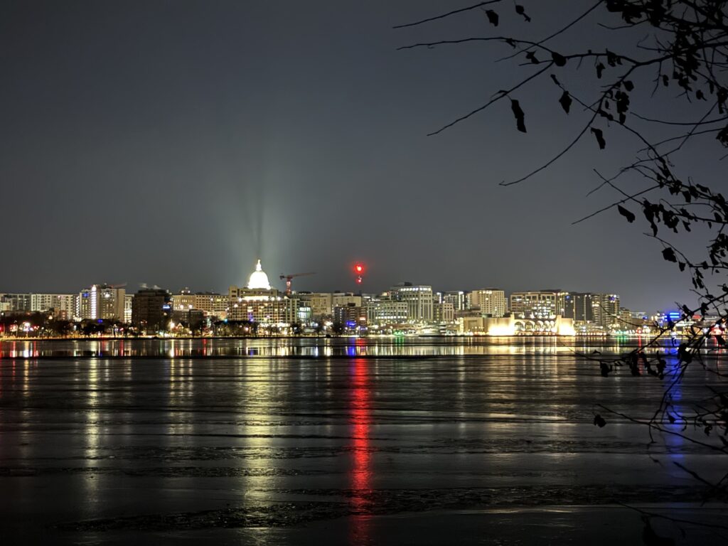 まぁ、このへんはほぼほぼ子供向けのディスプレイなんだが、その外れから見た湖の向こうの州会議事堂は、なかなか幻想的だった。