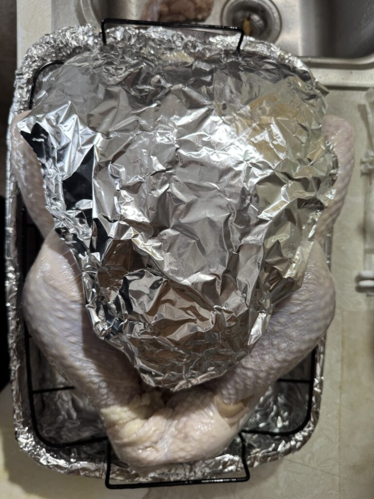 アルトン・ブラウンの動画でやってたおすすめの方法。胸肉に火が通り過ぎないように、アルミホイルで前掛けをつくる。
