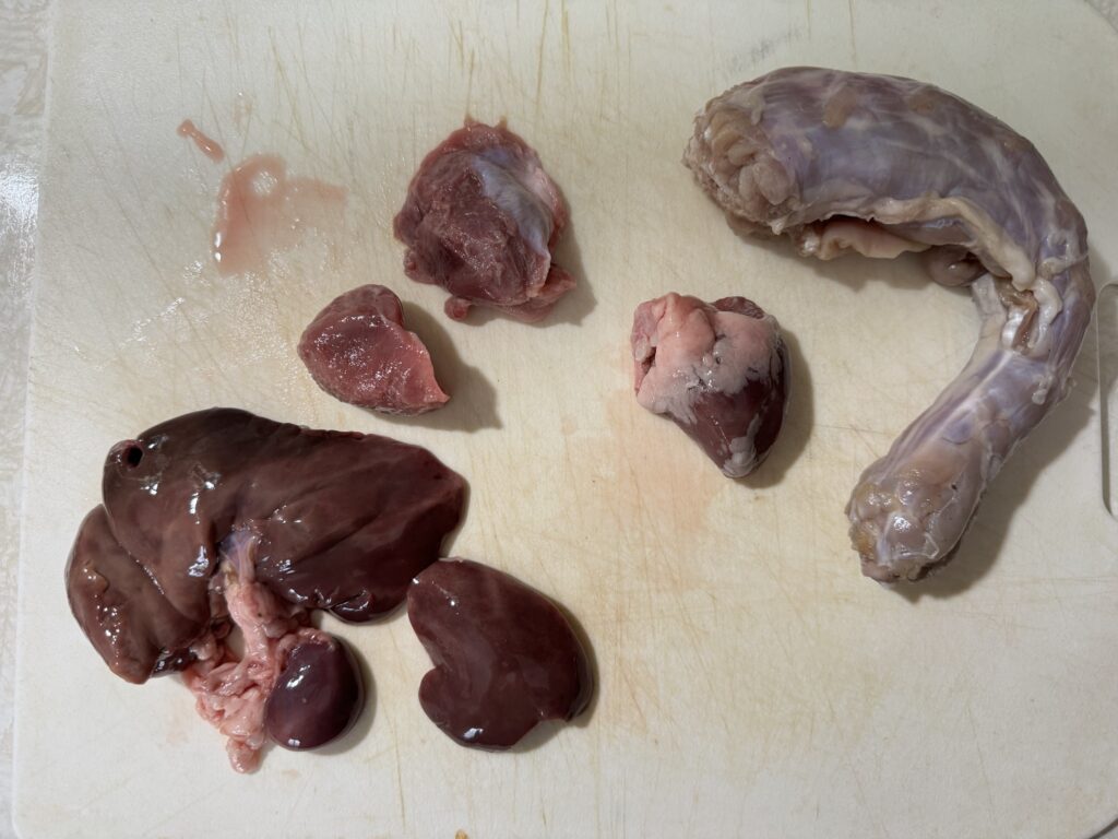 腹と首の空洞に首肉とレバー、心臓、砂肝などが詰まっているので、それを取り出す。
