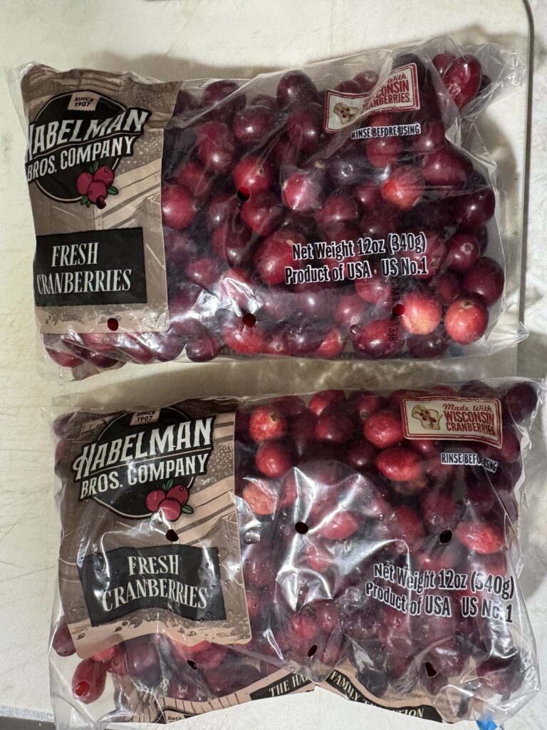 作り方は、たんにスーパーに売ってる生クランベリー12オンス袋1袋につき、オレンジジュース1カップ、砂糖半カップを加えて煮るだけ。